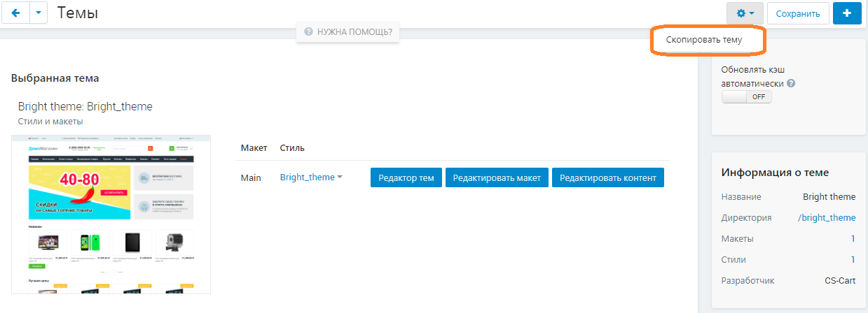 Перед тем, как начать разработку собственной темы, необходимо клонировать тему Responsive, которая есть в CS-Cart по умолчанию.