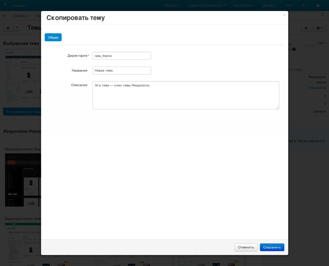 На основе текущей активной темы будет создана тема-клон с названием Новая тема. Родительской темой у новой темы будет Responsive. В директории design/themes появится новая папка под тем названием, которое было указано в поле Директория.