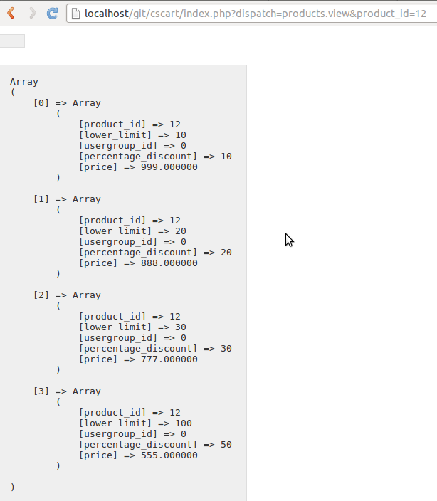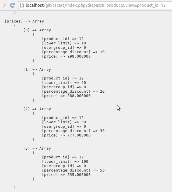 $productsпосле функции и изучаем массив с данными.К сожалению, информации о оптовых скидках не появилось. У функции есть параметр