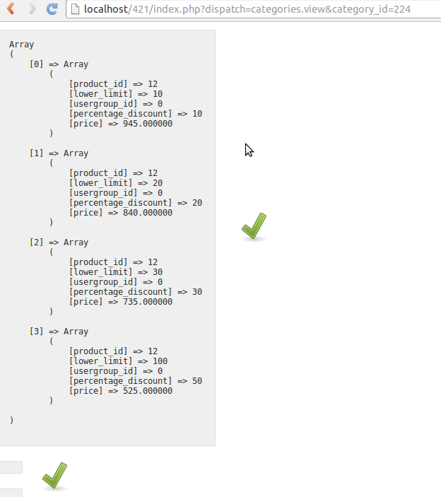 fn_print_rиз хука и переносим его в контроллер categories.php, в то место где переменная$productsпередаётся на отображение. Делаем это, чтобы проверить появились ли данные о скидках вне модуля.1 2