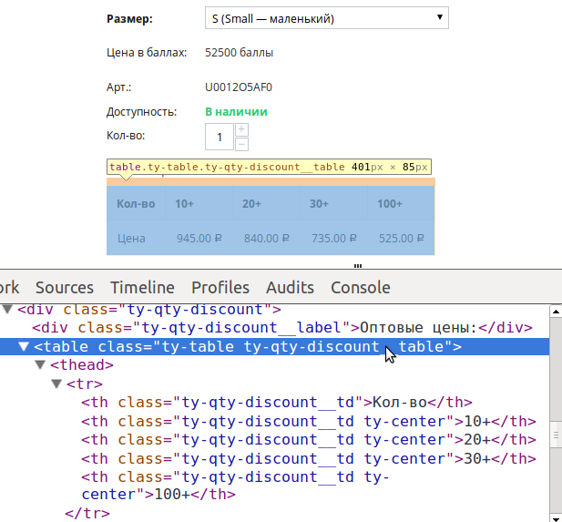 Откроем детальную страницу товара и посмотрим код блока оптовых скидок в браузере: