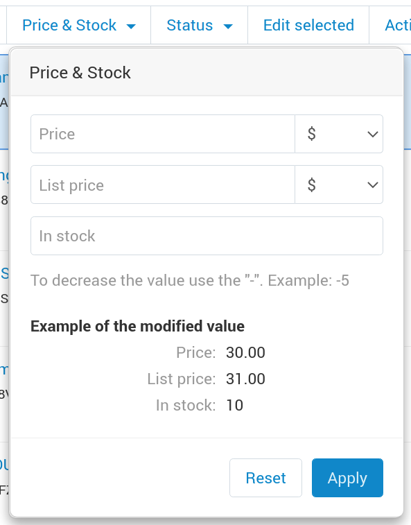 В CS-Cart есть контекстное меню — механизм для массовых действий над сущностями. Он позволяет выделять элементы из списка и массово работать с ними. Чтобы посмотреть, как выглядит контекстное меню, достаточно зайти на список товаров и выделить один из них. Все действия над объектами в списке должны быть реализованы через контекстное меню.