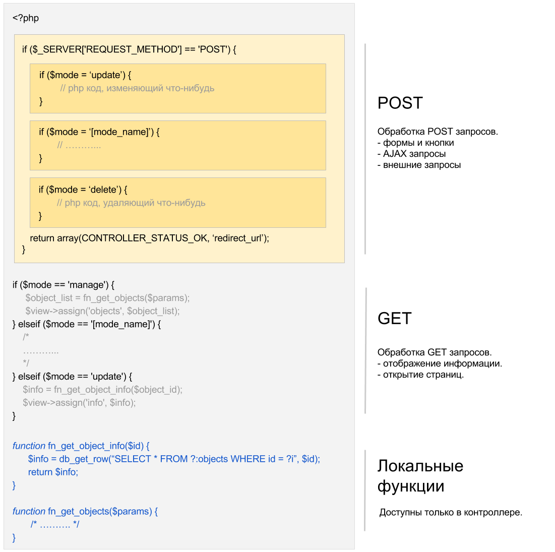Секция GET-запросов всегда располагается после секции POST в файле контроллера и разделена на блоки режимов (mode) работы: