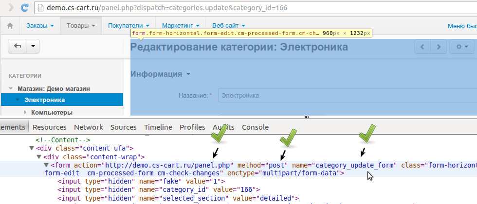 Когда мы нажимаем кнопку “Сохранить”, отправляется POST-запрос с данными формы редактирования категории на адрес demo.cs-cart.ru/panel.php.