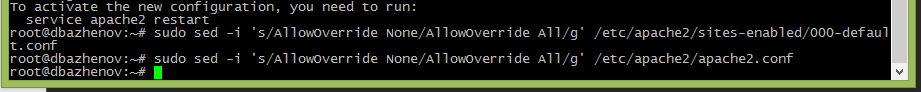 sudo sed -i 's/AllowOverride None/AllowOverride All/g' /etc/apache2/sites-enabled/000-default.confsudo sed -i 's/AllowOverride None/AllowOverride All/g' /etc/apache2/apache2.confВажно