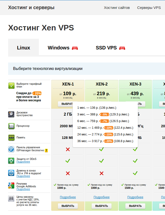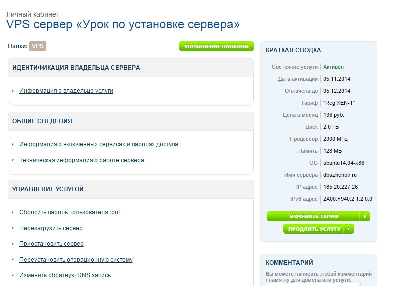 Для инструкции был зарегистрирован VPS сервер от компании Reg.ru по тарифу XEN-1 .