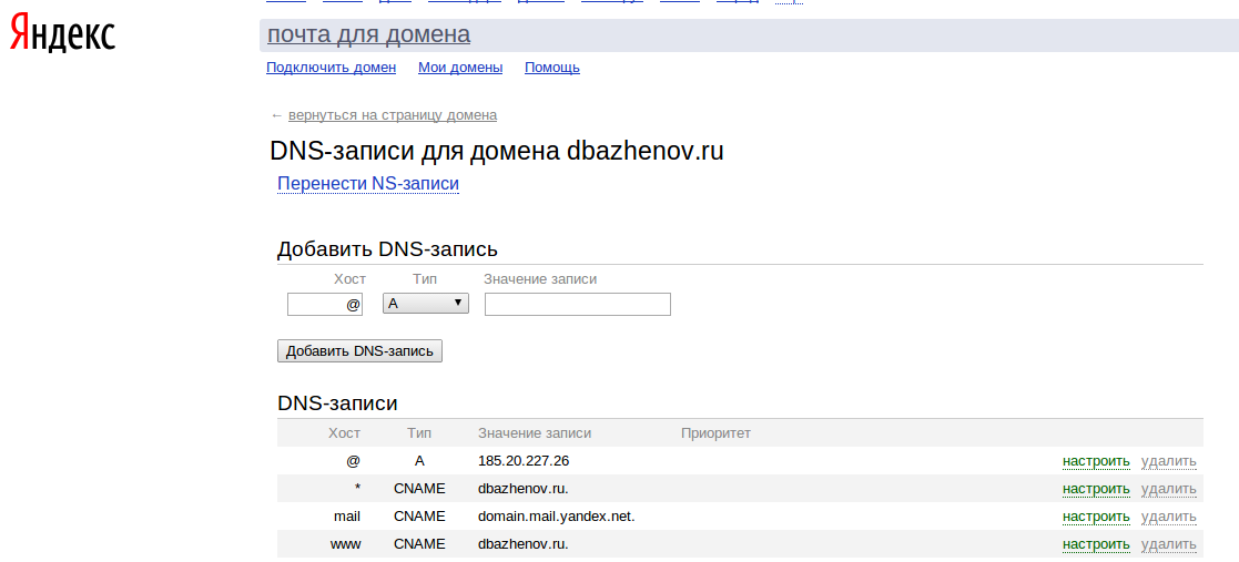 - Подключили домен сервису DNS-хостинг Яндекса . Таким образом управление DNS записями осуществляем через Яндекс. Также, это позволяет подключить почту для домена.