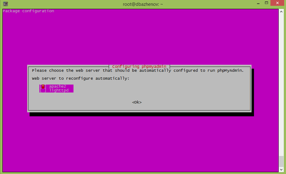 Появится окно атоматической конфигурации веб-сервера. С помощью клавижи Пробела выбираем Apache2 , на нем должна быть звёздочка выбора. Жмём OK