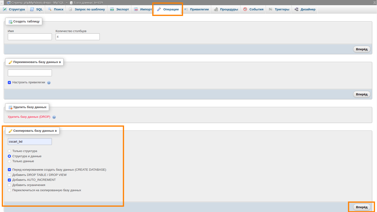 В разделе Скопировать базу данных в введите имя новой базы данных, выставьте настройки так, как показано на картинке, и нажмите Вперёд: