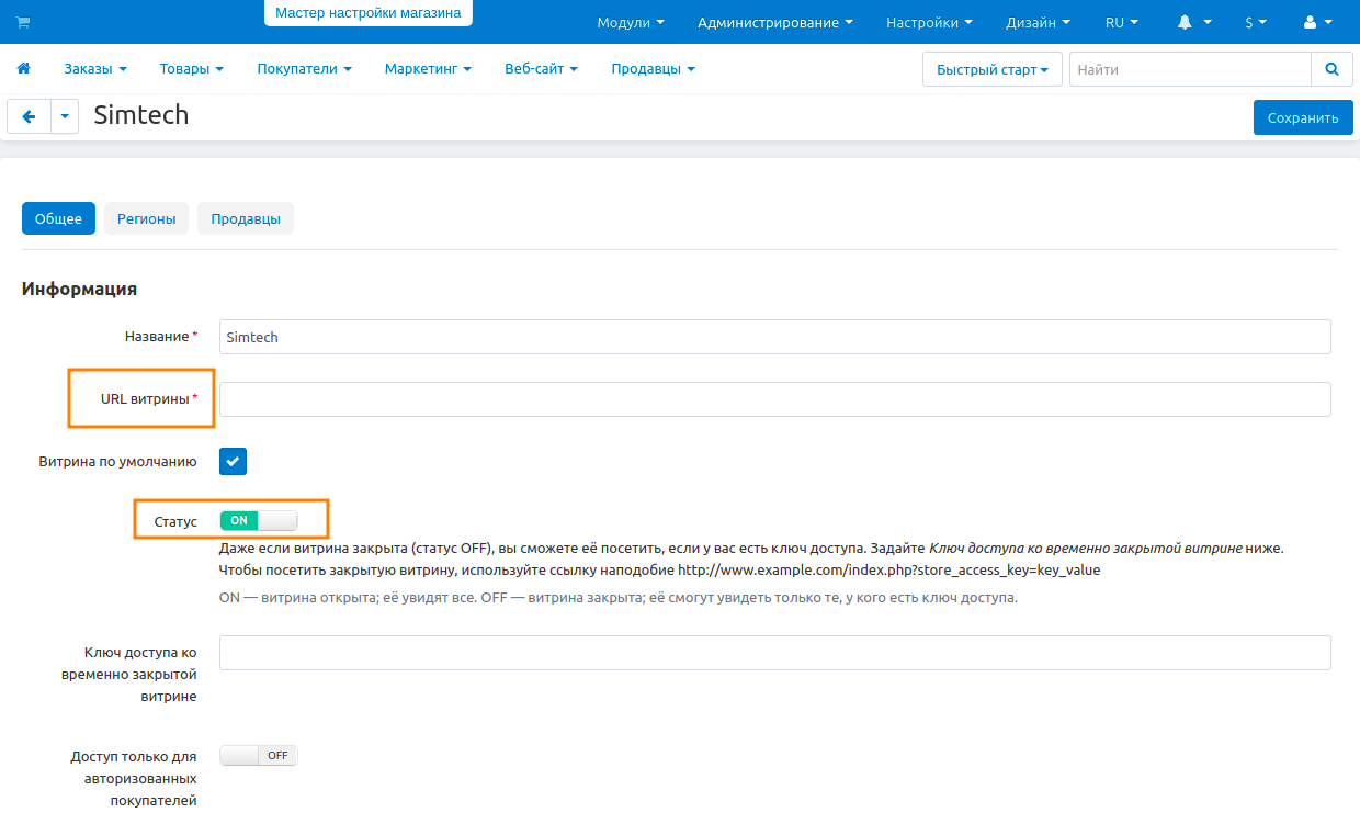 4.2. Обновите URL-адреса витрины скопированного магазина. Для этого войдите в панель администратора, которая теперь находится в имядомена/подкаталог/admin.php. На странице Администрирование → Витрины найдите витрину своего магазина и отредактируйте URL-адрес. Не забудьте также закрыть витрину: