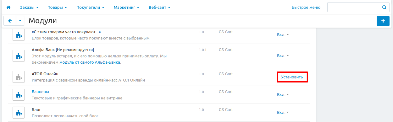 Найдите в списке модулей АТОЛ Онлайн и нажмите на его название.