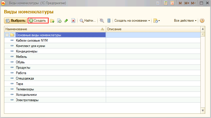 В открывшемся окне “Виды номенклатуры” нажмите на кнопку “Создать” для создания нового вида номенклатуры с характеристикой.