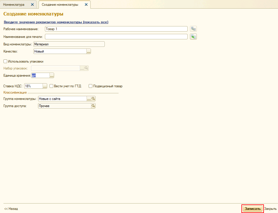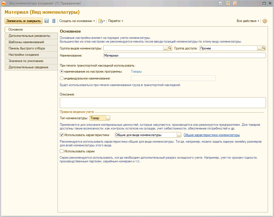 После добавления всех необходимых характеристик закройте окно “Характеристики номенклатуры”. В окне “Вид номенклатуры” нажмите на кнопку “Записать и закрыть”. В окне списка видов номенклатур выберите созданную и нажмите на кнопку “Выбрать”. В окне создания номенклатуры нажмите на кнопку “Далее”. На следующем шаге заполните обязательные поля “Рабочее наименование” и “Единица хранения”. После заполнения всех необходимых полей нажмите на кнопку “Записать”.