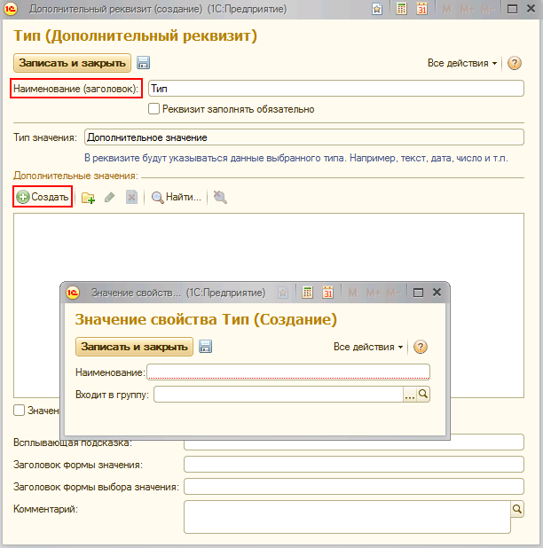 В окне “Дополнительный реквизит” заполните поле “Наименование” и добавьте дополнительные значения.