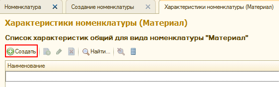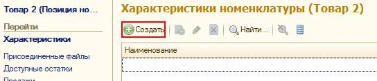 В открывшемся окне “Характеристики номенклатуры” нажмите на кнопку “Создать”.