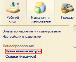 Для того, чтобы созданные характеристики выгружались в интернет-магазин, необходимо добавить цены товаров. Пройдите в меню “Маркетинг и планирование” нажмите на ссылку “Цены номенклатуры”.