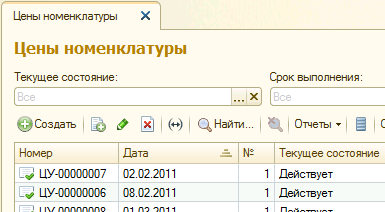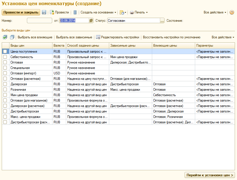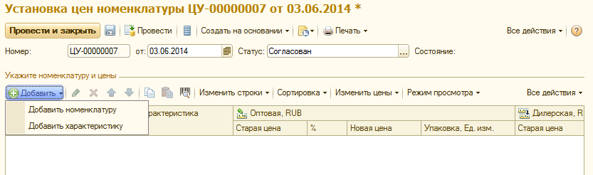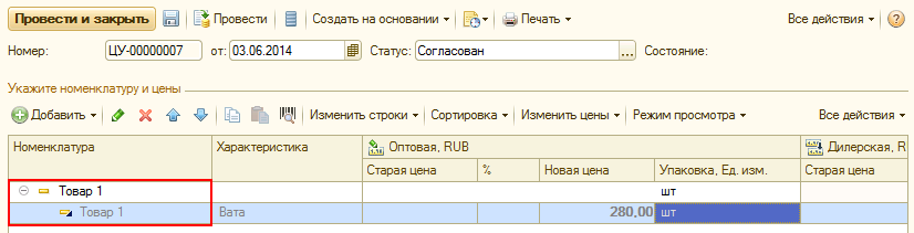 Выберите “Номенклатуру”, введите её цены в колонках “Новая цена” и нажмите на кнопку “Провести и закрыть”.