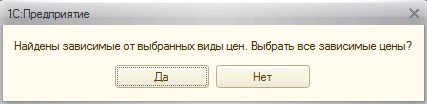 Появится окно запроса “Выбрать все зависимые цены?”; нажмите на кнопку “Да”, если необходимо задать значения зависимых цен.