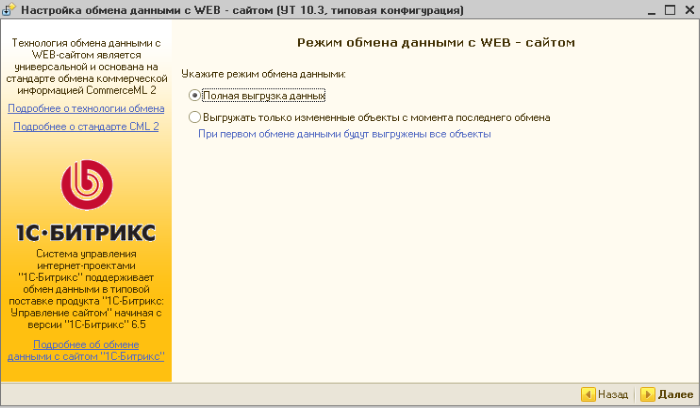 На следующем шаге укажите режим обмена данными и нажмите кнопку “Далее”.