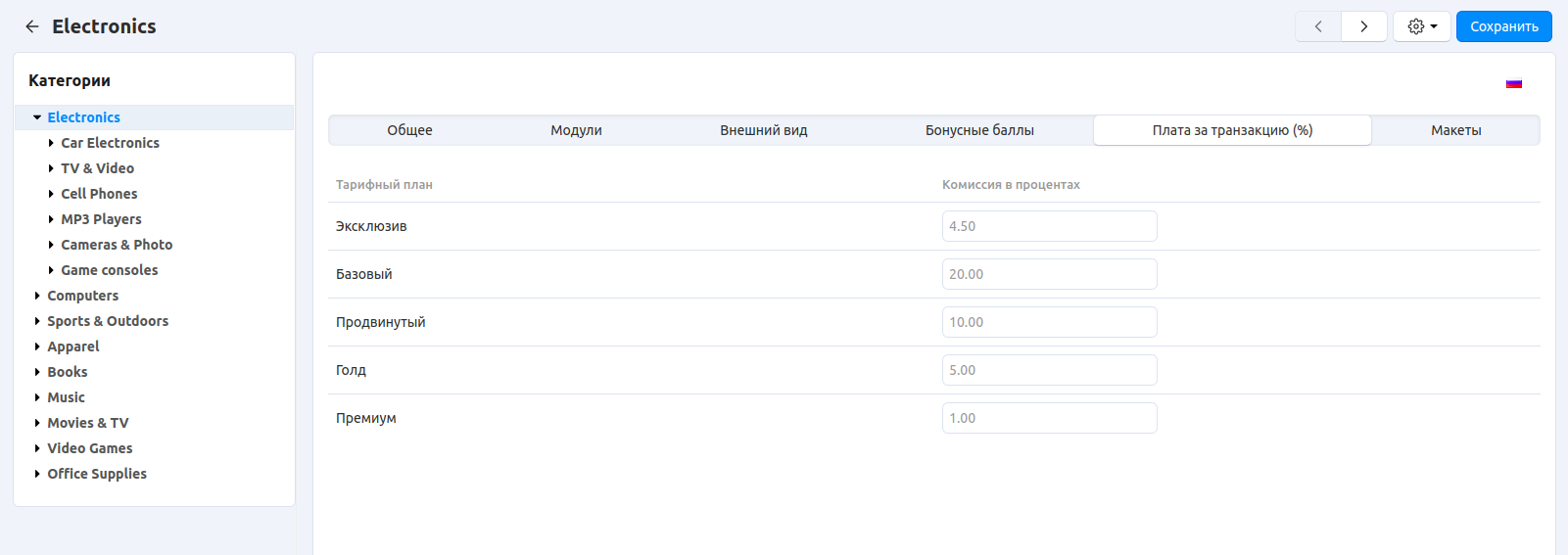 Комиссии из модуля “Тарифные планы для продавцов” распространяются на все товары, независимо от их категорий. Если вы хотите установить разную комиссию для разных категорий, используйте модуль Тарифные планы для продавцов: Комиссии для категорий.