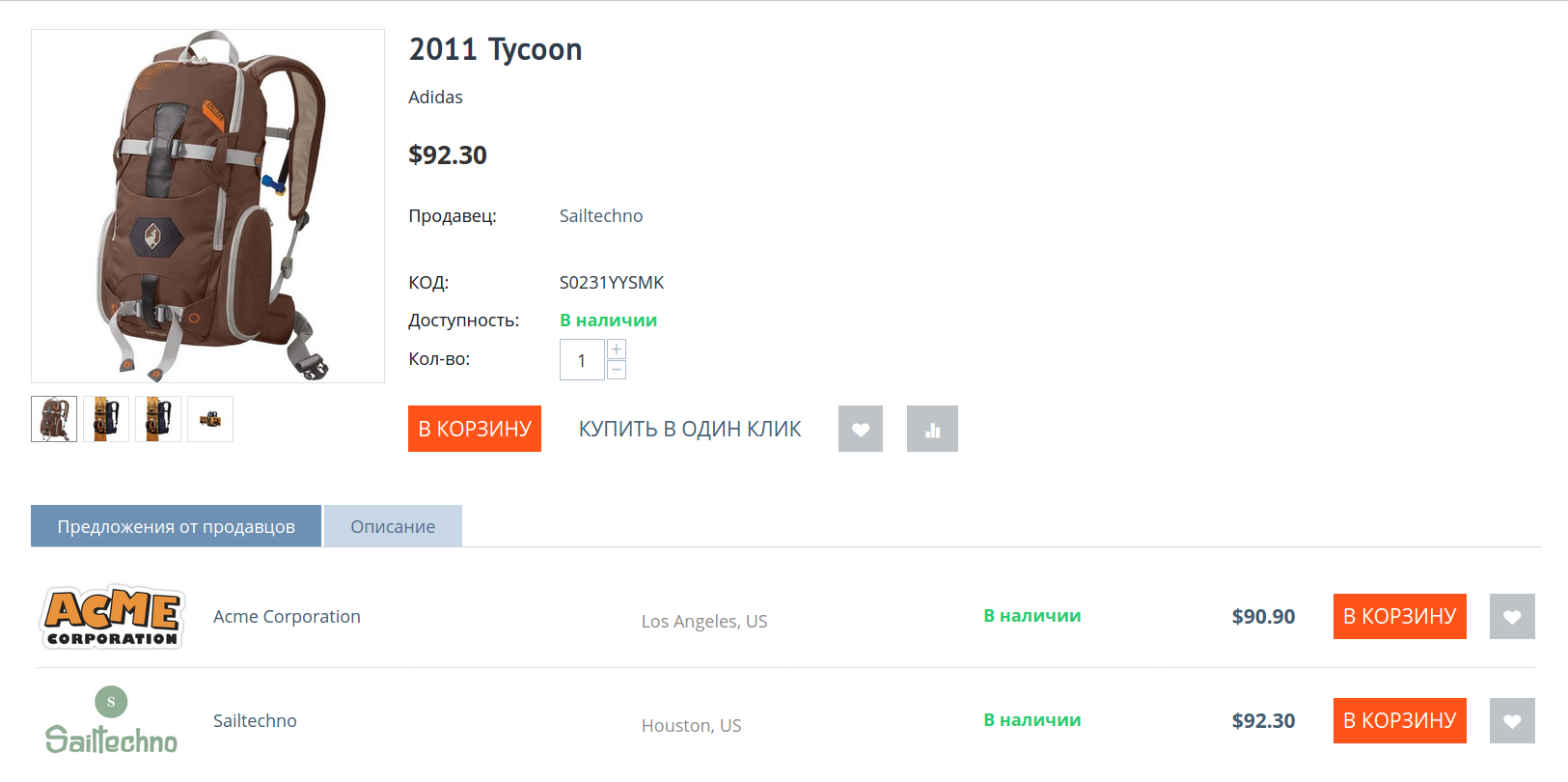 Модуль поможет избежать ситуации, когда несколько продавцов создают с нуля один и тот же товар, но с отличающимся описанием и изображениями. При просмотре товара на витрине покупатели увидят, какие продавцы предлагают этот товар, и на каких условиях.
