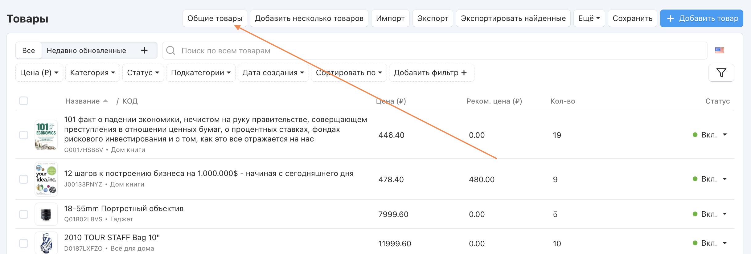 В Multi-Vendor(CS-Cart для маркетплейсов) только администратор может создать каталог общих товаров. После активации модуля “Общие товары для продавцов” вы заметите, что кнопка “Общие товары” появилась в списке товаров в панели администратора. Она приведет вас на страницу “Товары, которые можно продавать”.