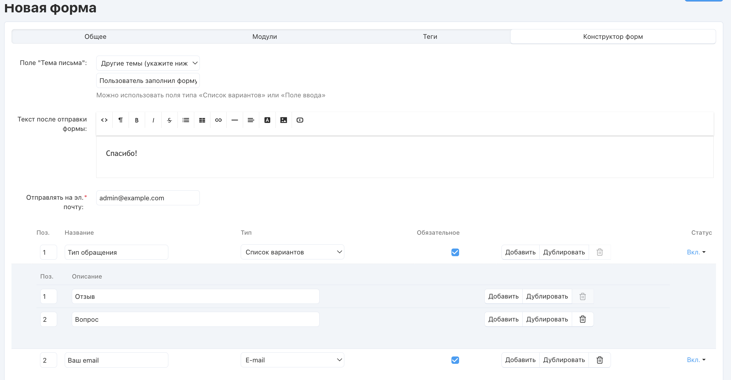 - Название формы — темой письма служит само название формы.