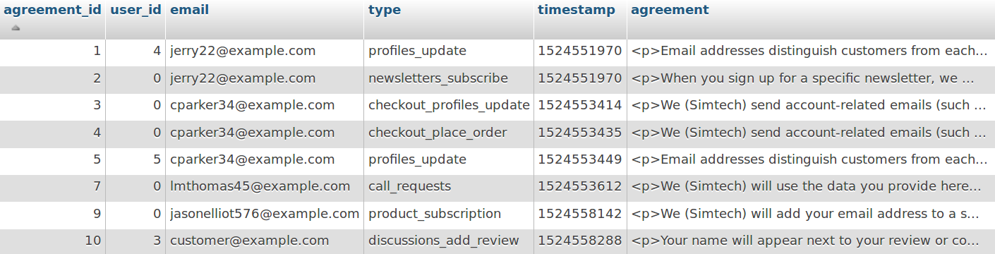 cscart_gdpr_user_agreements. Она включает тексты уведомлений о персональных данных, какими они были на момент предоставления согласия. Эту информацию можно просмотреть только в базе данных напрямую.