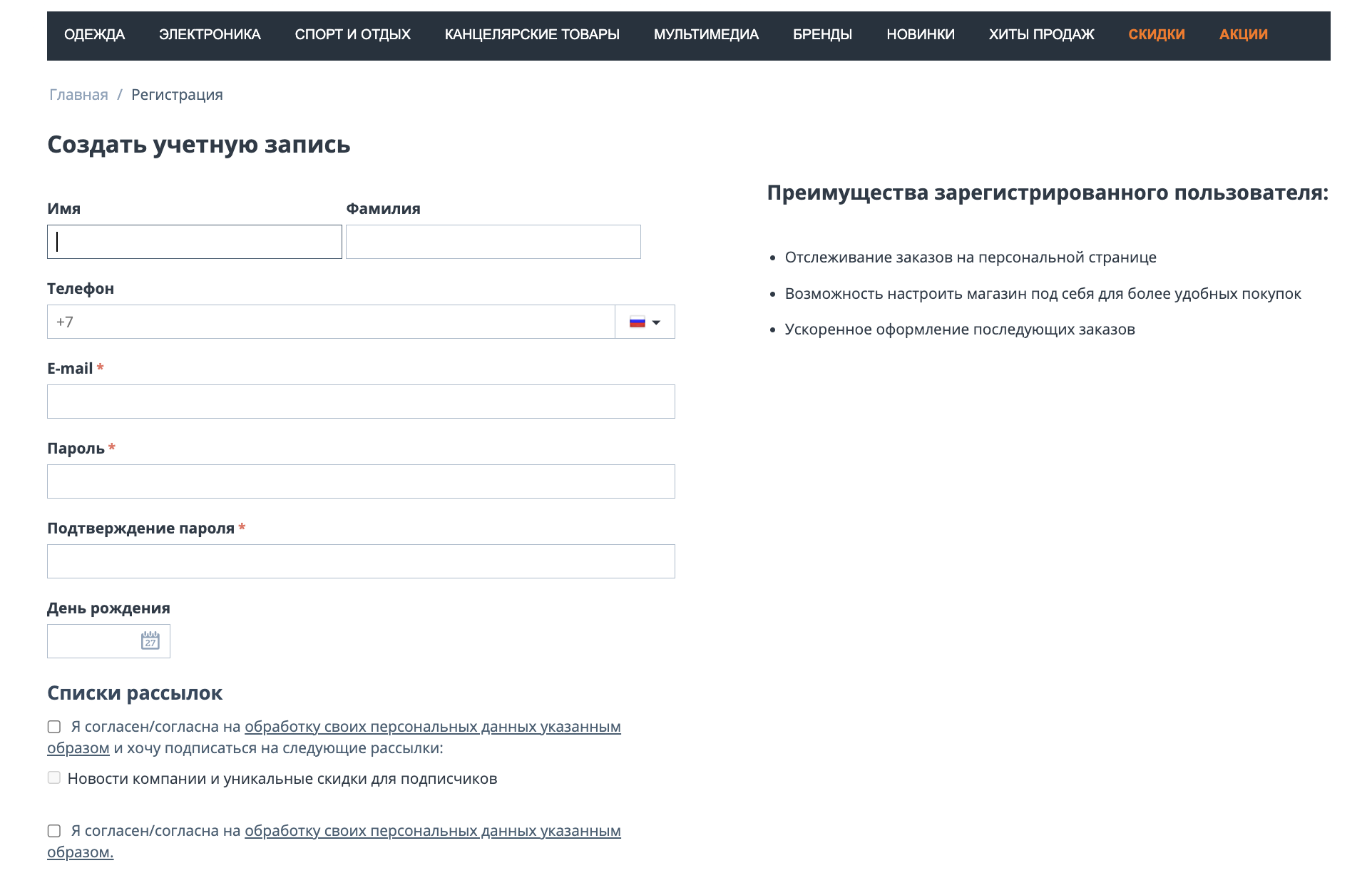 Флажки согласия на обработку данных, которые могут отображаться в стандартных местах сбора персональных данных (например, при оформлении заказа, регистрации, подписке на рассылку и т. д.).