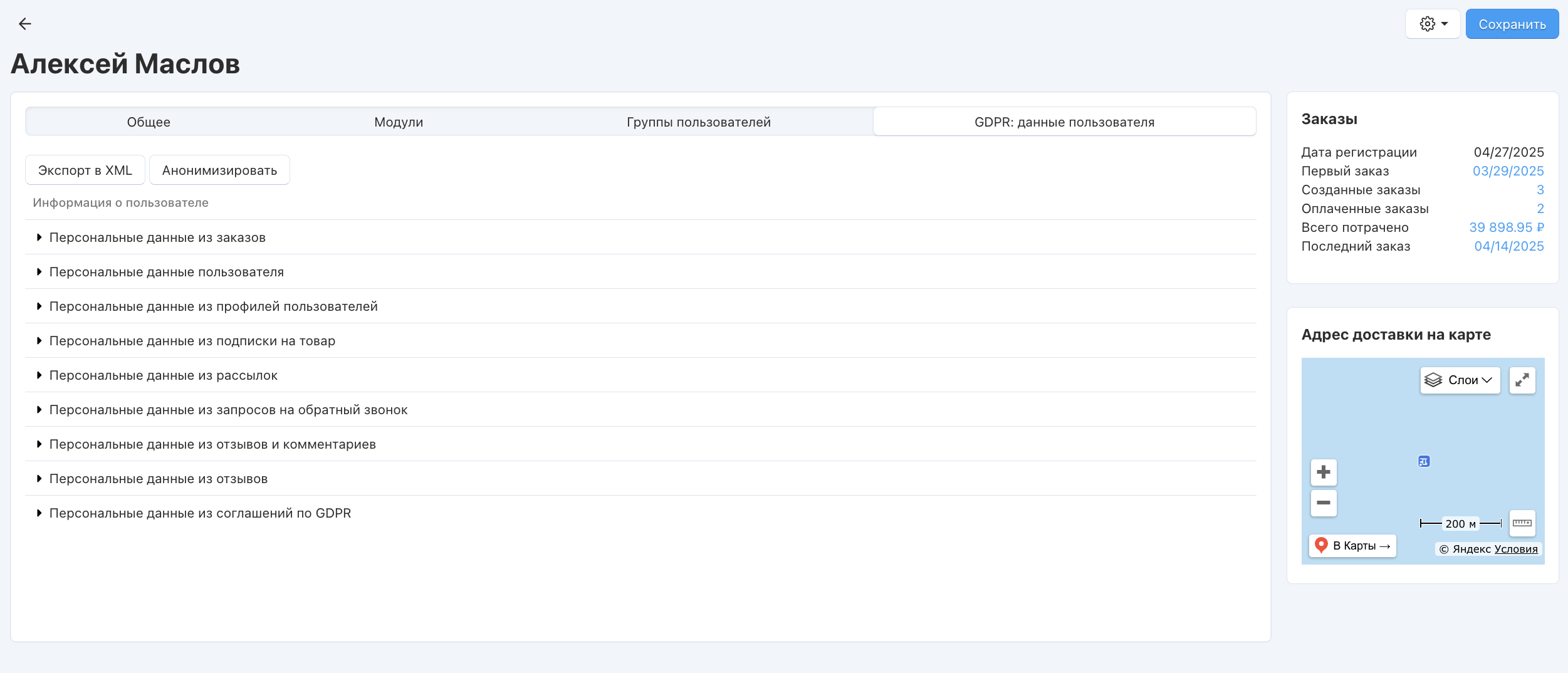 Возможность экспортировать персональные данные покупателя в XML-файл по запросу.