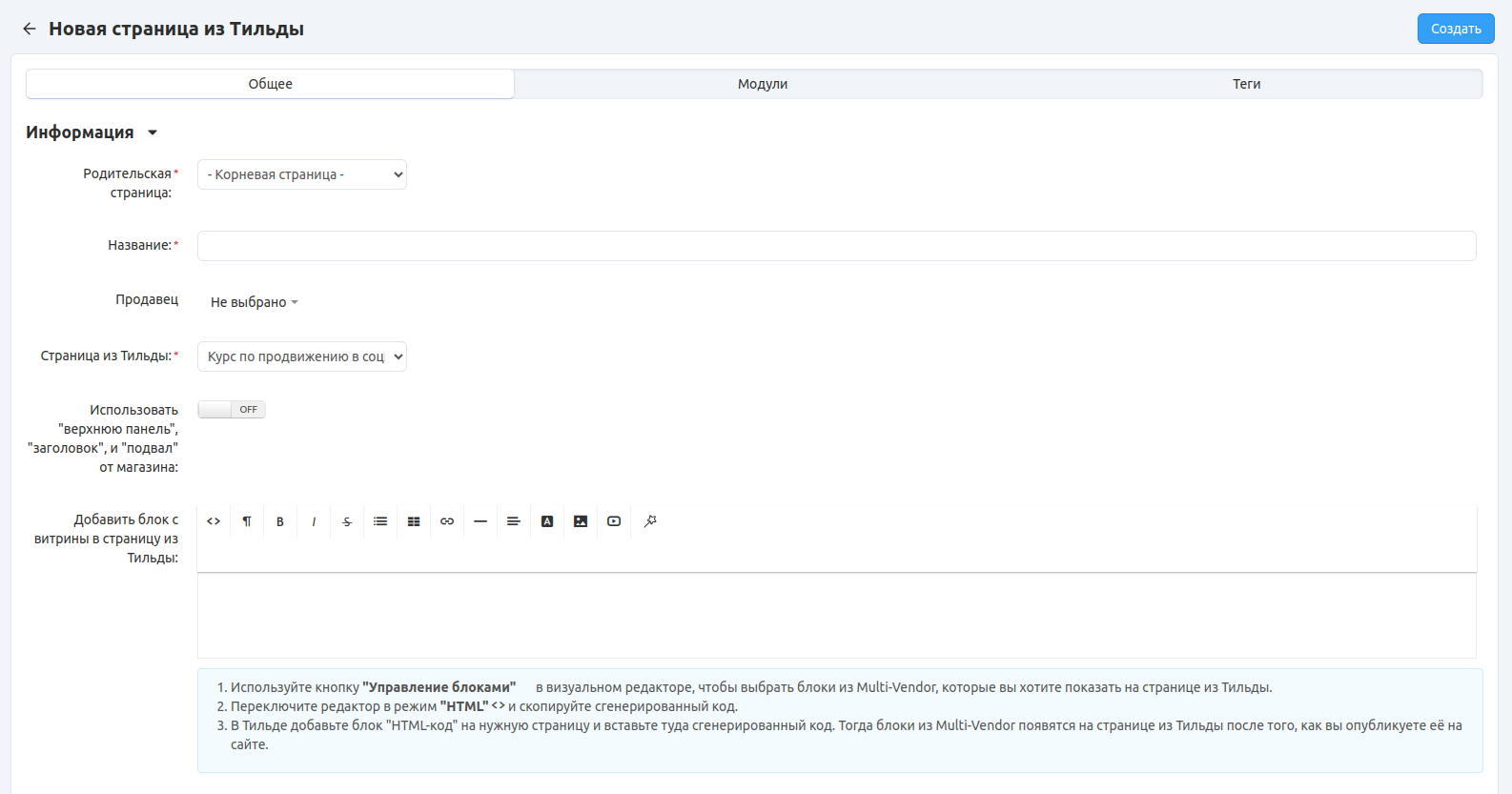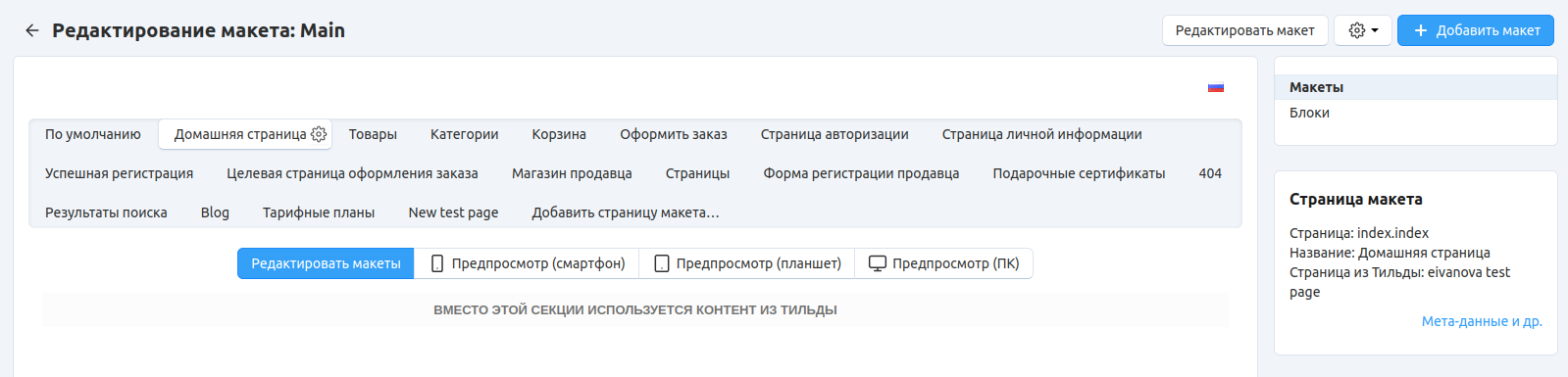 Теперь наполнение существовавшей в магазине страницы заменится на страницу из Tilda.