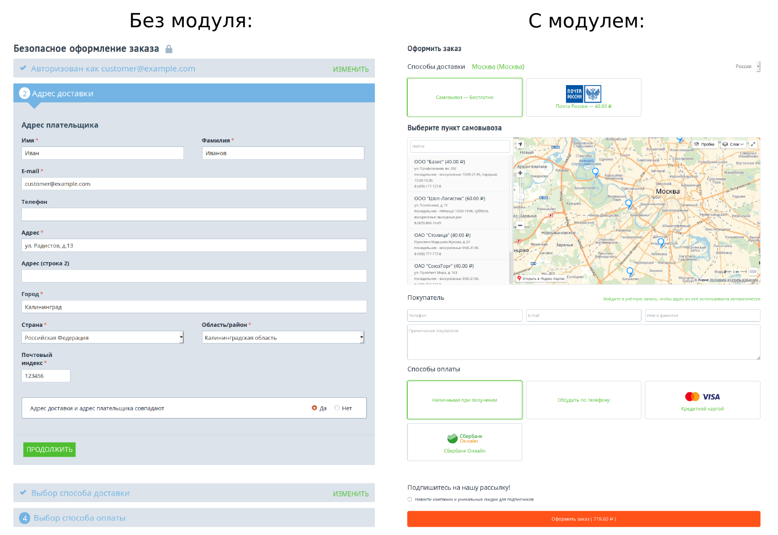 Модуль упрощает страницу оформления заказа: убирает разделение на шаги и уменьшает количество действий покупателя.