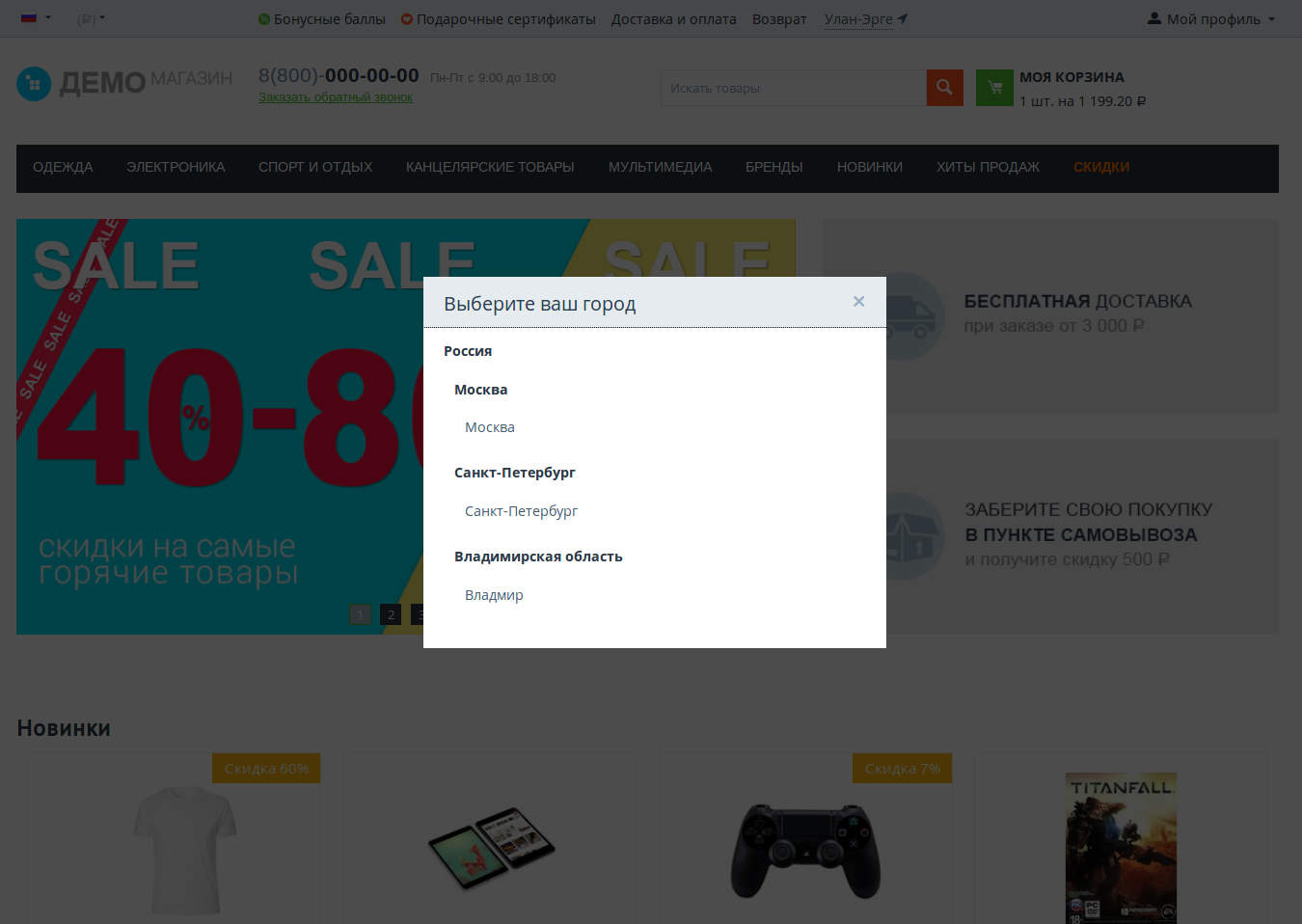 Уже на главной странице магазина есть блок Местоположение покупателя (за него отвечает одноимённый модуль). Этот блок автоматически определяет город покупателя и позволяет выбрать другой.