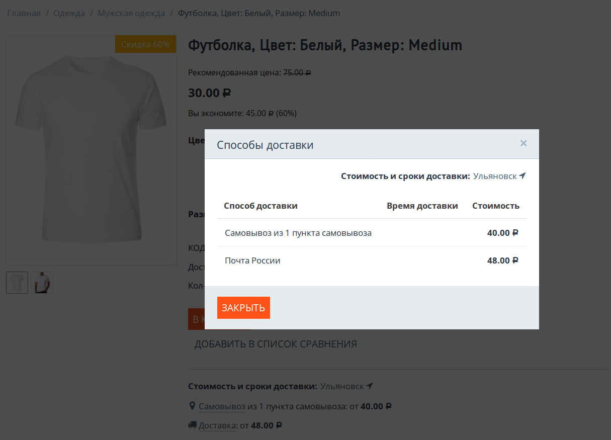(опционально) Оценка стоимости и сроков доставки на странице товара в зависимости от местоположения покупателя.