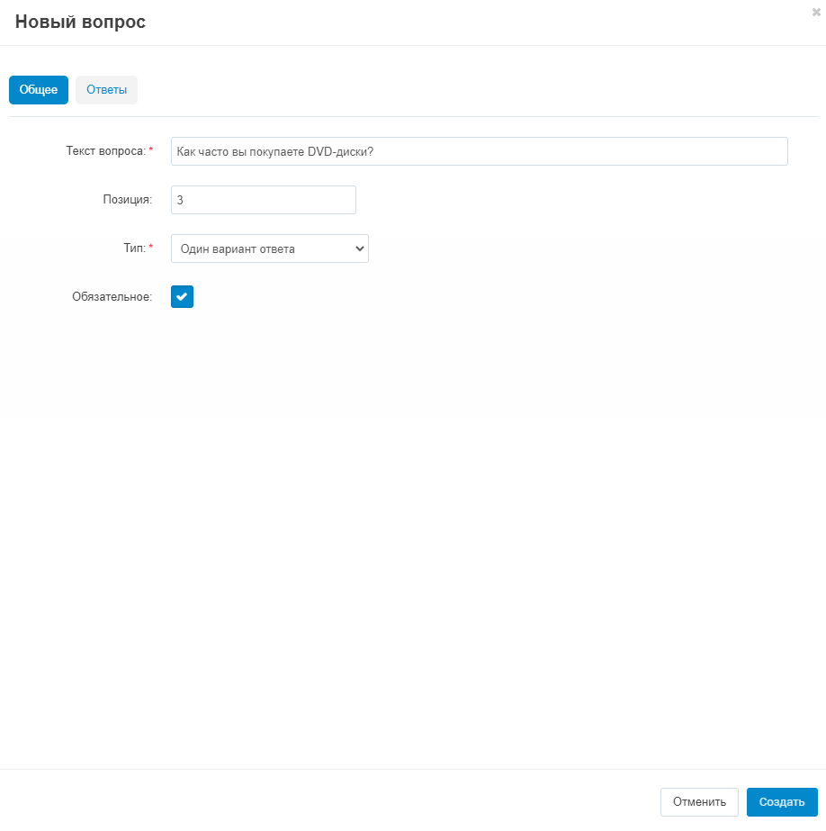 В открывшемся окне перейдите на вкладку Ответы и нажмите +, чтобы добавить несколько вариантов. Кликните Создать.