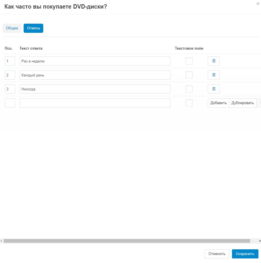 Введите Текст вопроса и выберите его Тип из выпадающего списка.