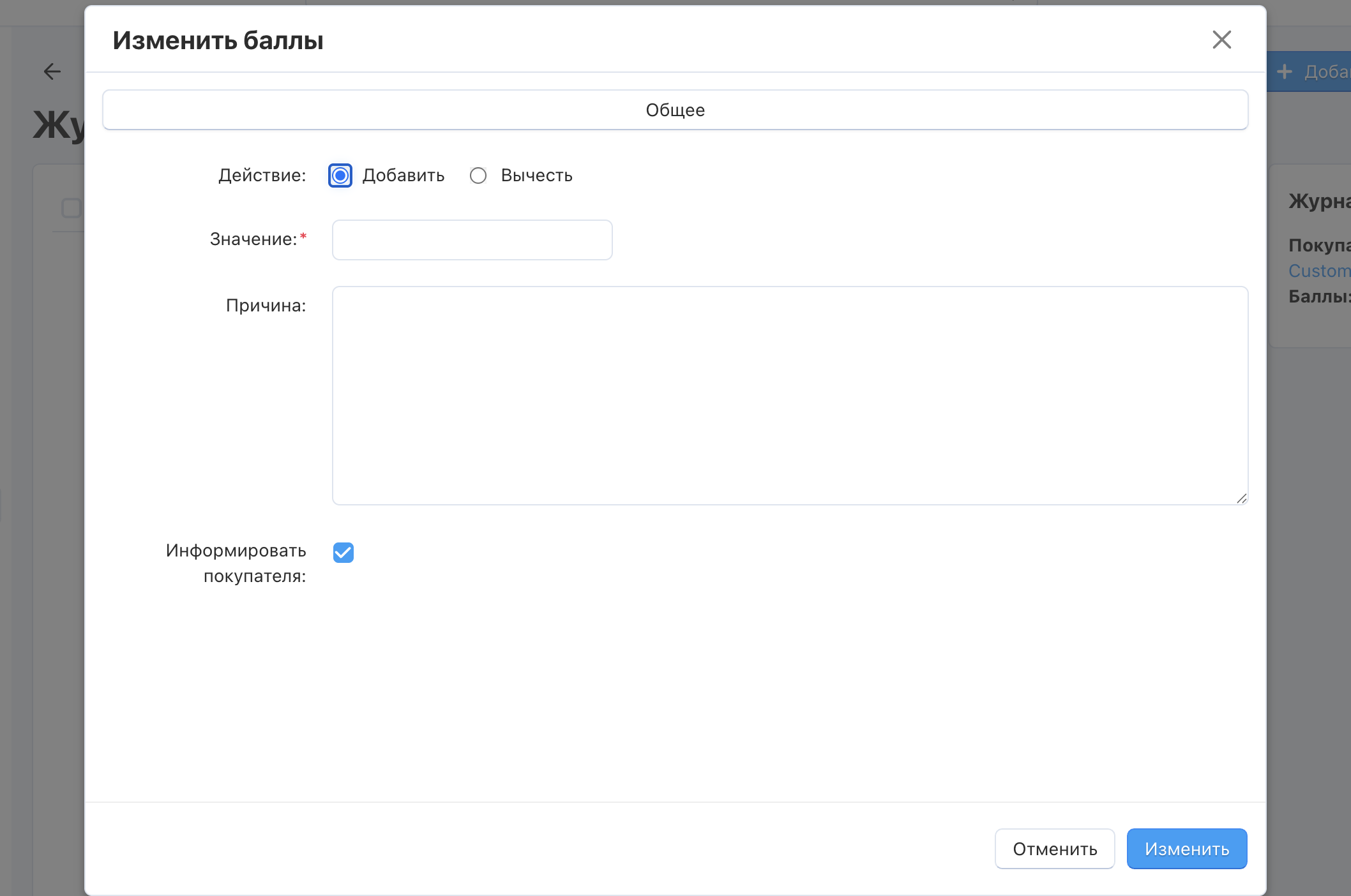 Откроется всплывающее окно. Выберите действие Добавить и введите нужное количество баллов в поле Значение.