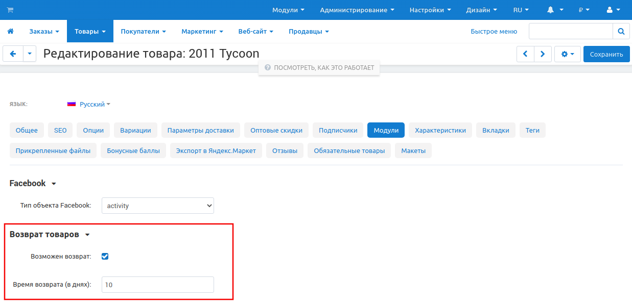 В разделе Возврат товаров поставьте галочку Возможен возврат.