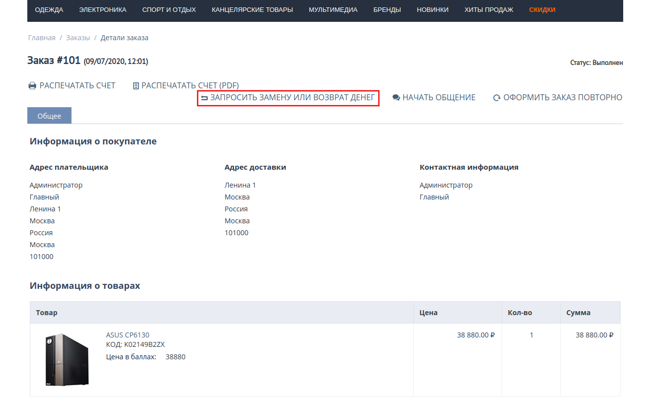 Покупатель сможет отправить запрос на возврат на странице сведений о заказе, нажав Запросить замену или возврат денег.