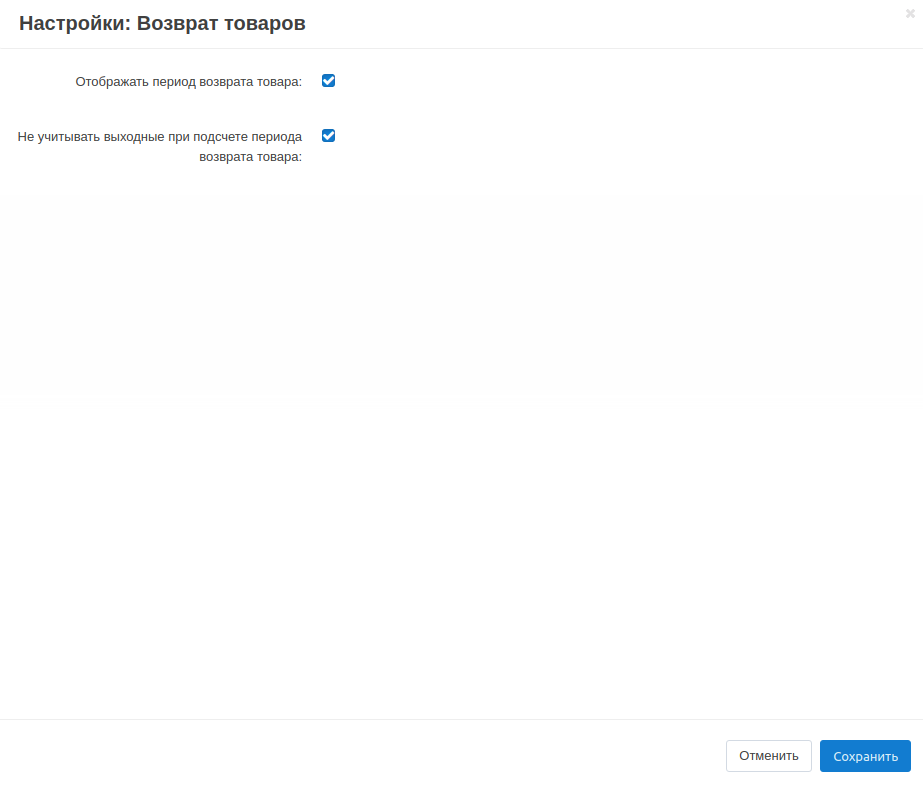 - Отображать период возврата товара — поставьте галочку, чтобы период возврата товара отображался на витрине.