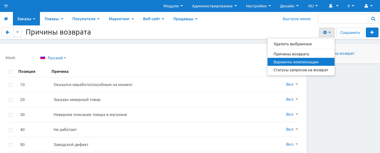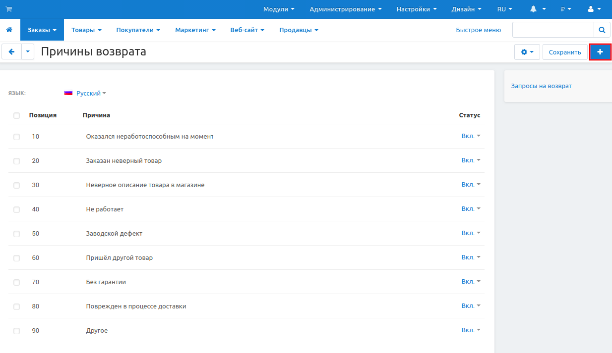 Модуль Возврат товаров установлен по умолчанию. Если он не активен (статус Выкл.), смените статус модуля на Вкл.