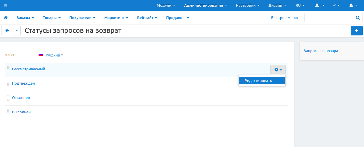 Откройте страницу Администирование → Статусы запросов на возврат в панели администратора.