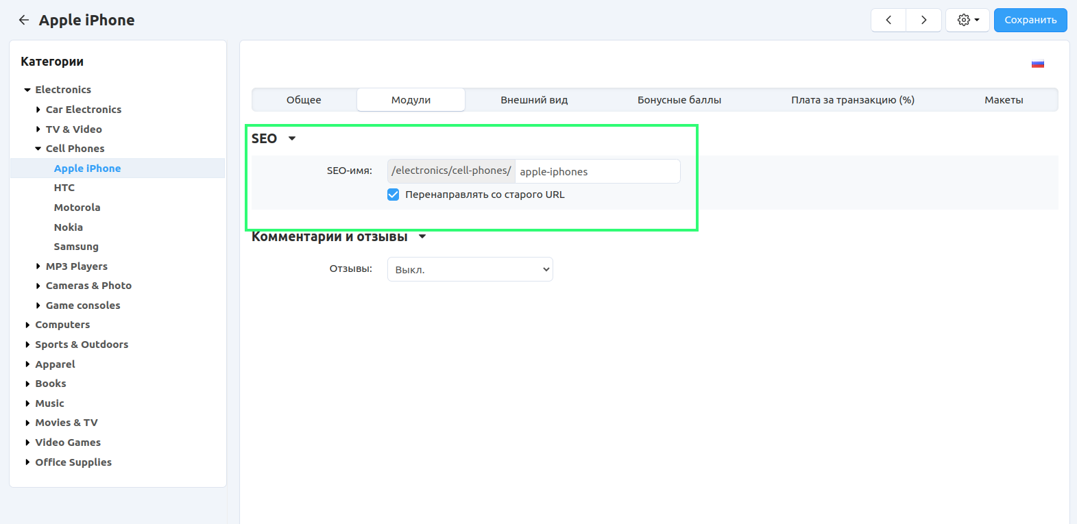 В панели администратора откройте страницу Товары → Категории и перейдите на страницу редактирования любой категории.