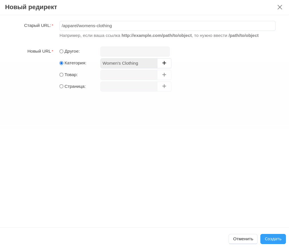 В новом окне заполните поле Старый URL. К примеру, если ваш URL был http://example.com/path/to/object, введите /path/to/object.