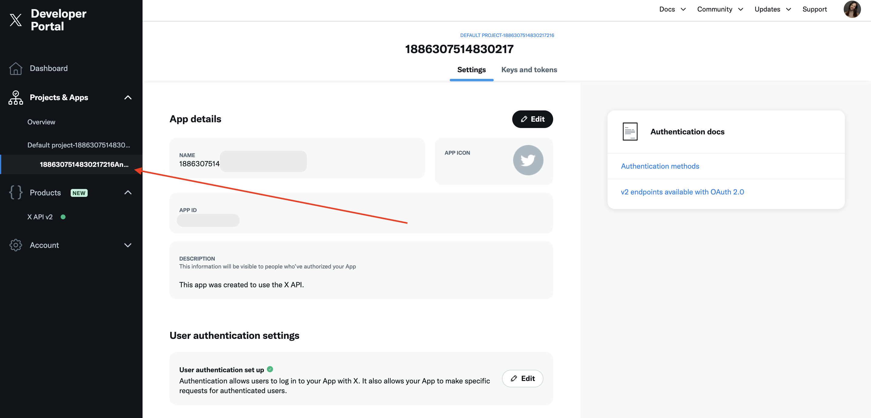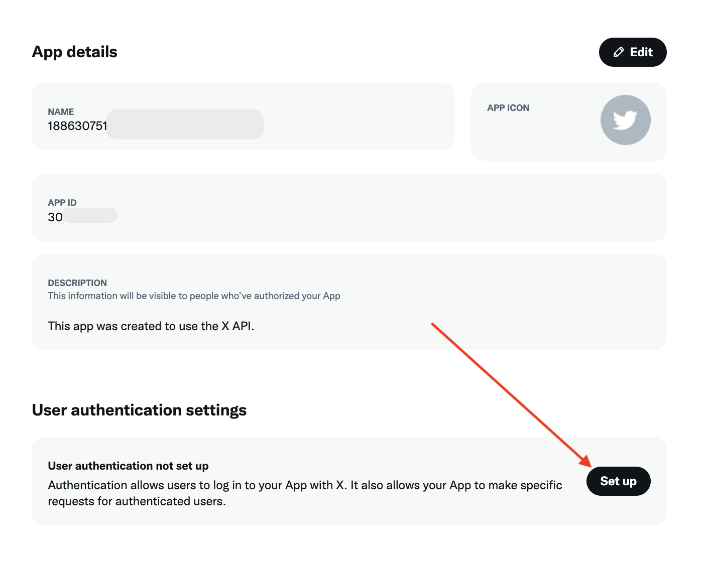 Чтобы настроить передачу данных аккаунта X нужно добавить доступы для приложения. Найдите настройку User authentication settings и нажмите кнопку Set up. Если вы уже настраивали аутентификацию, то можете редактировать настройки, нажав Edit.