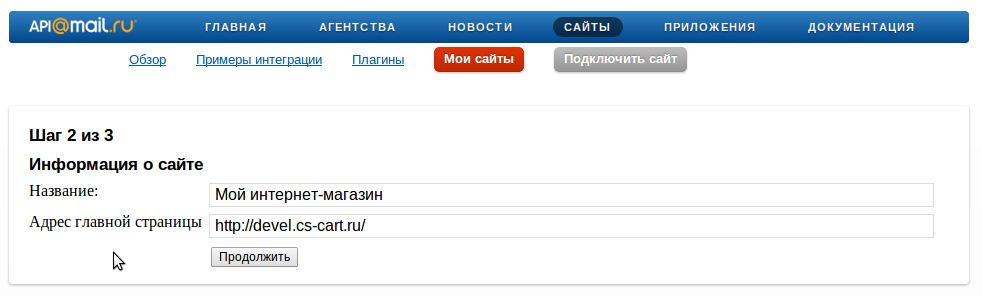 Пройдите в сервис «Сайты» от api.mail.ru: http://api.mail.ru/sites/