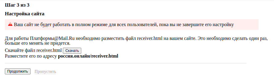 Во избежание возможных ошибок, скачайте и разместите файл receiver.html в файловом менеджере в основной папке вашего интернет-магазина или маркетплейса, как это предложено mail.ru. Нажмите Пропустить.