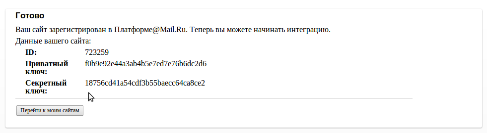 Сайт будет добавлен, и вы получите все необходимые ключи:
