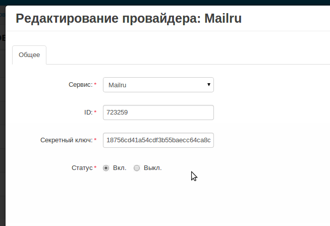 - Секретный ключ (его нужно использовать для настройки провайдера в панели администратора)