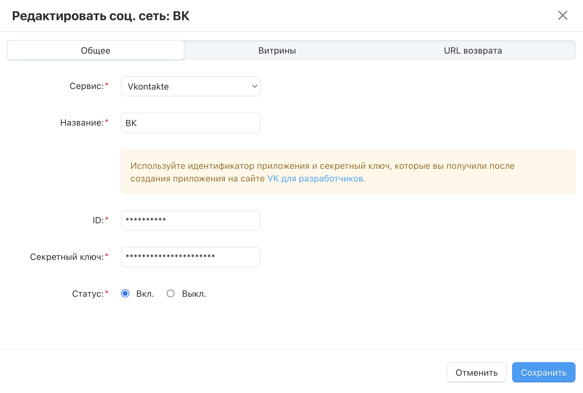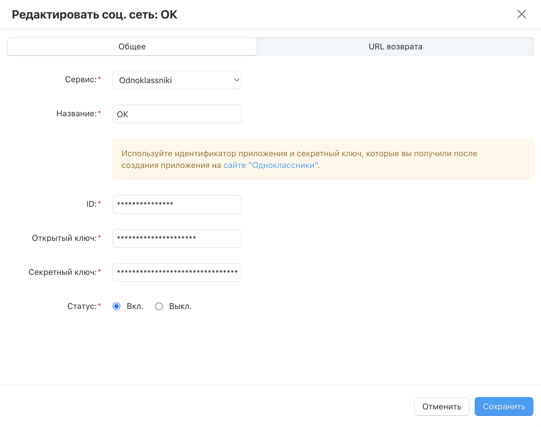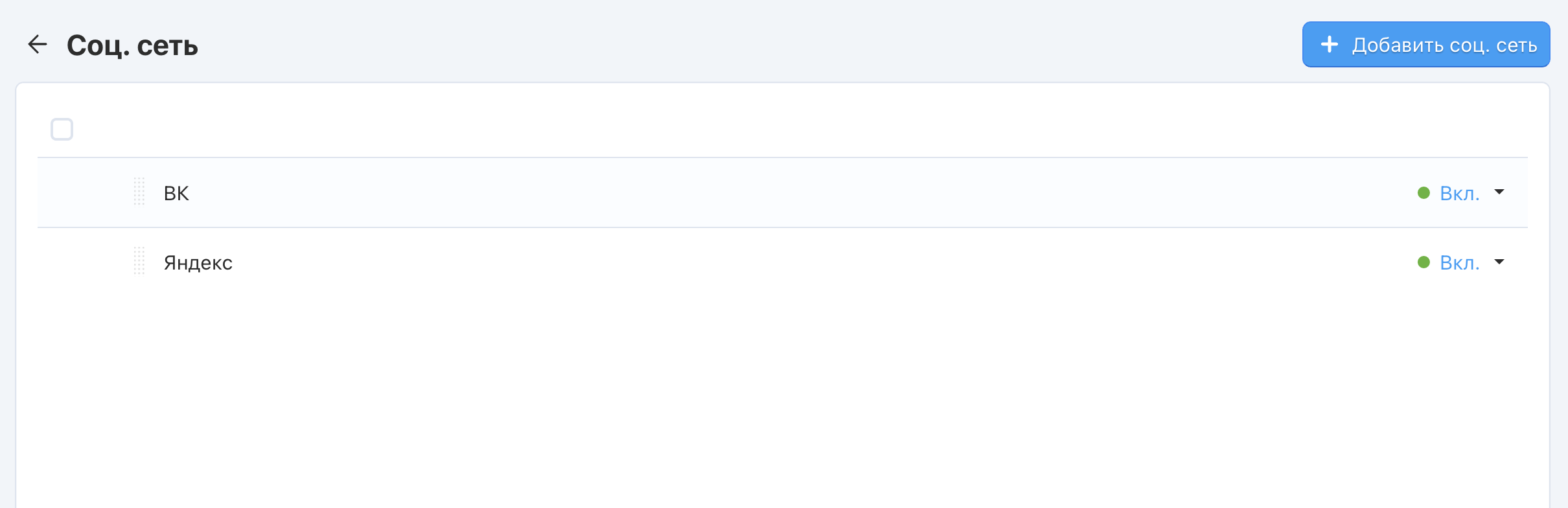 Создайте нового провайдера (сервис) с помощью кнопки + Добавить соц. сеть.